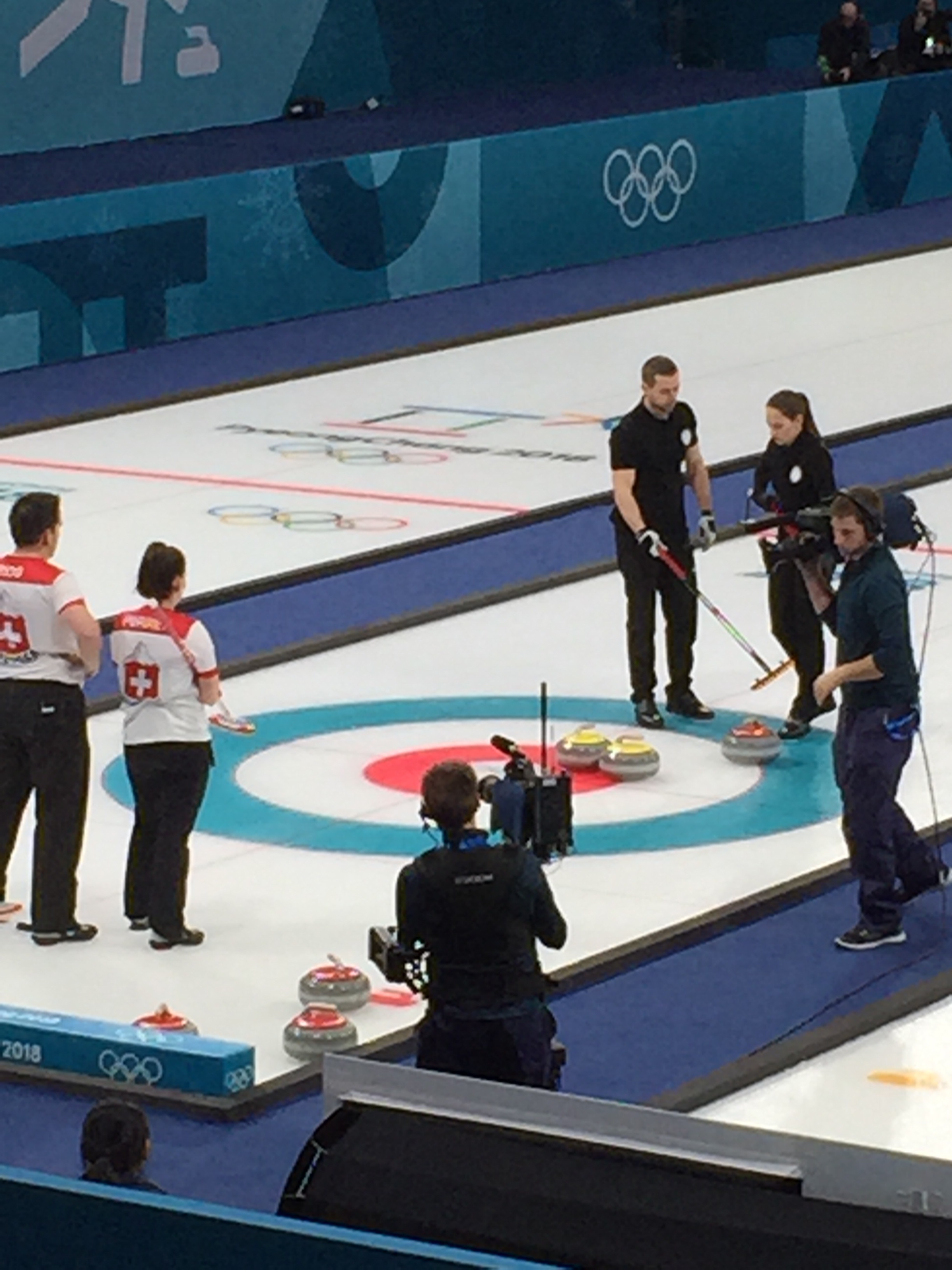 It was perfectly fine though because I got to spend the bulk of the night inside watching the semi-finals of the mixed doubles curling between the Swiss and the O.A.R. For those of you who don’t know, the Russians were disqualified from the Olympics this year due to some questionable practices during the last Winter Olympics. Because of this, they were allowed to send some athletes who did not engage in this behavior, but they could not come under the Russian flag, so they are designated as the O.A.R. At first I couldn’t imagine what this meant. My thought was “Officially Ain’t Russian” but I soon discovered while watching the match that they were consider “Olympic Athlete from Russia”. In retrospect, it is a more respectable distinction.