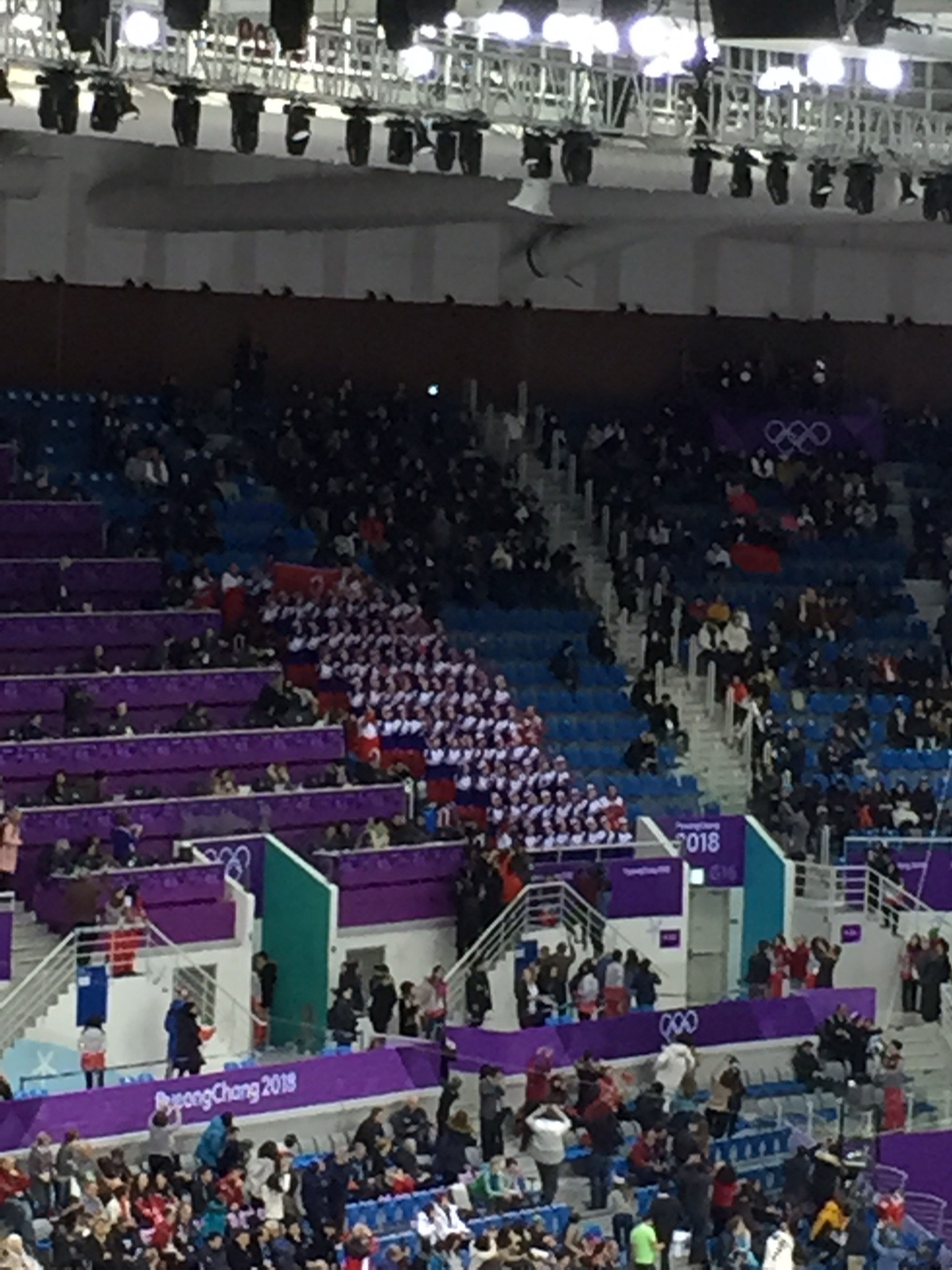 Besides the North Korean circus, I also got to witness figure skating. I have to say that my trepidation going into the event was unfounded. Figure skating is really amazing to watch live. I hated it growing up because that is all they seemed to show when they aired the Winter Olympics, and I wanted to see things like hockey, ski jumping, and the bobsled. But after I have been to one of these competitions, I start to understand the power of it. These people are spectacular athletes and they can do things that I would never imagine possible in my mind. The loud music just adds to the experience making it such an amazing thing to see. I would highly recommend that if you ever get a chance to go see figure skating live you should do it because it is worth the experience. After every performance people throw stuffed animals and flowers out to the competitors to show their appreciation for what they had just witnessed, and it was fun to watch the young Korean girls skate out on the ice to collect all the accolades. It is also great to see such a huge representation of all the cultures of the world present at this even that it makes it the real sport that represents the Winter Olympic games.