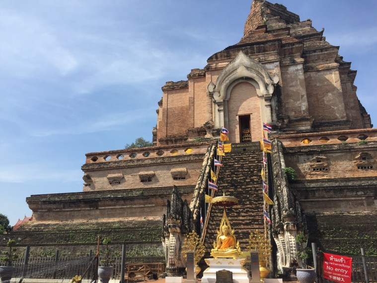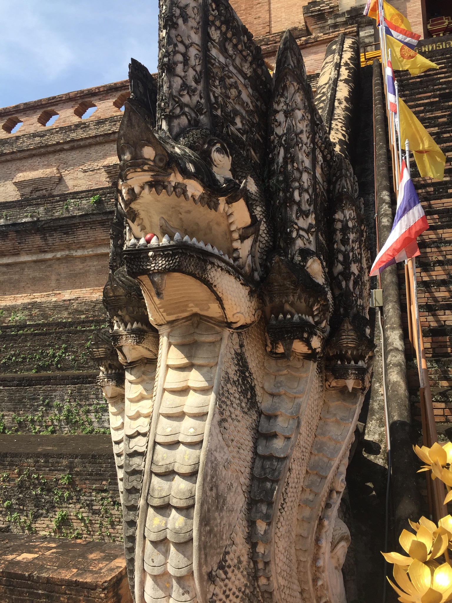 Every temple has a series of steps up to the inside of the building where you are supposed to take off your shoes. The steps are guarded on either side by some kind of creature depending on what part of the world you find yourself in. In Thailand, the common statue is of a naga. This mythical creature is said to live in the rivers, lakes, and ocean waters all around the country, and before the monsoon season, the citizens of the country will squirt water to appease these beasts so they will come out and spit water into the air causing for an exceptionally rainy season. Most of the statues I found at the temples had one head, but the ones at the Wat Chedi Luang seemed to be a hybrid of the hydra from ancient Greece. People do come and offer these creatures gifts, and you can see various fruits, and flowers laid at the ground in front of them. Somebody gave the one I saw an apple and placed it in his mouth.