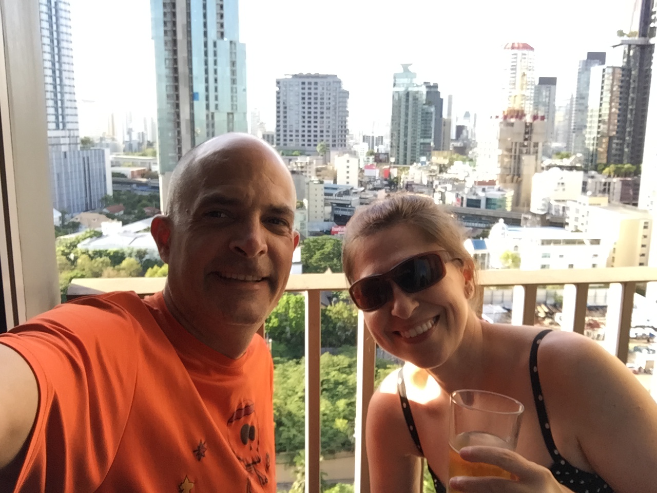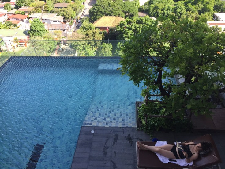 But the most exciting thing is that we have a rooftop pool that we get access to. Considering we are staying in the top level of this apartment building, we can get there is less than thirty second, and that includes putting on our swimsuits. It is situated in a nice alcove of the building that offers a shady retreat from the heat of Bangkok, and it is ten stories off of the ground so a nice breeze blows making it the perfect place to spend an afternoon.