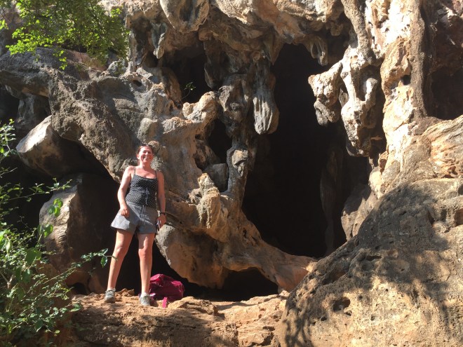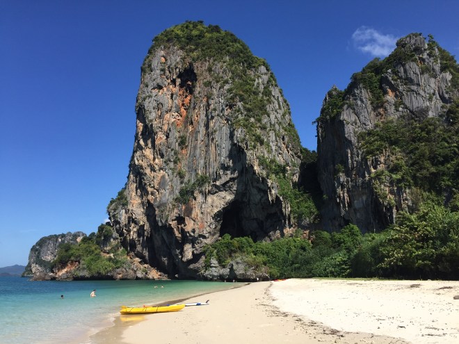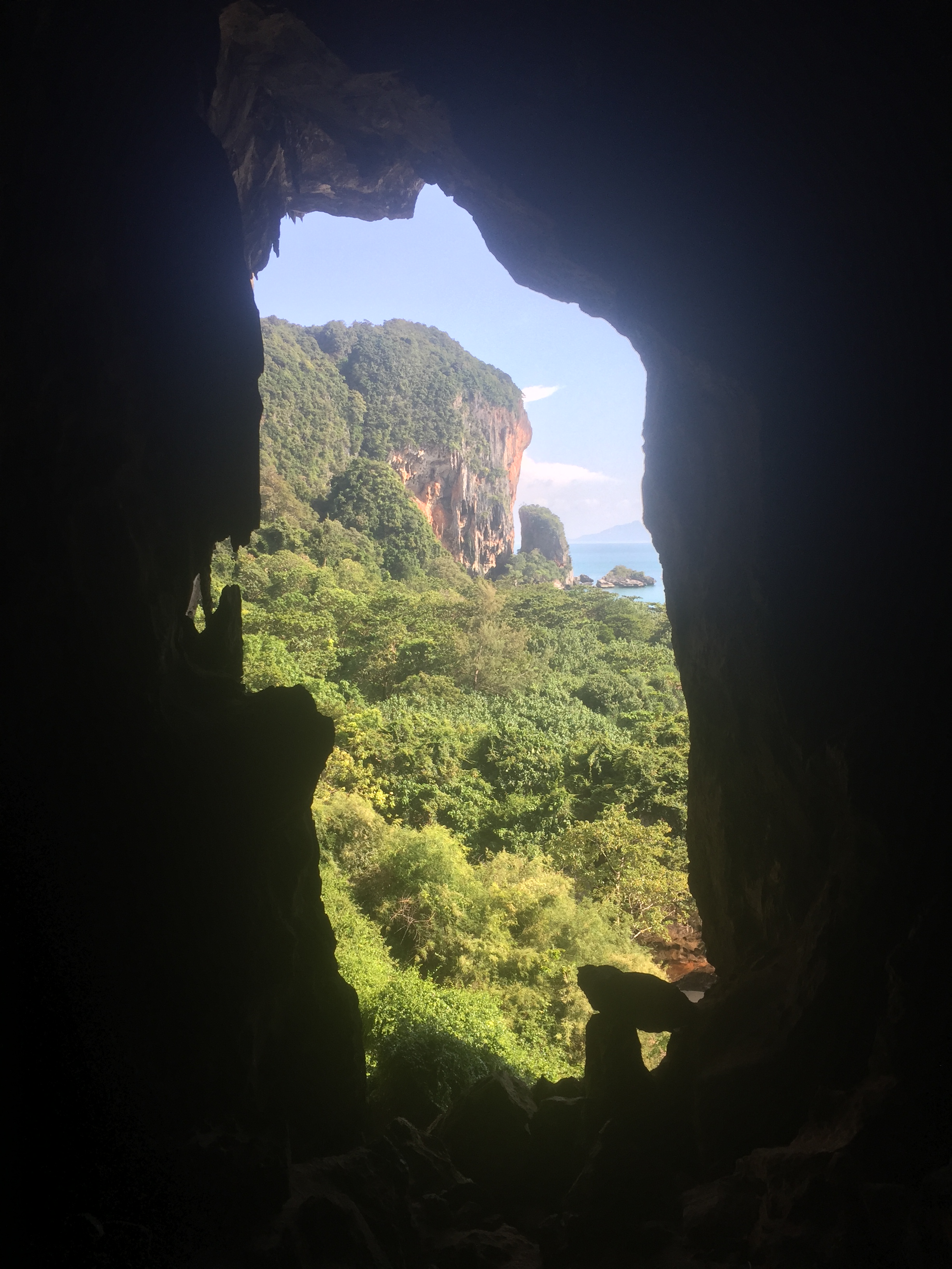 One of the things I could not help but notice while relaxing on Phra Nang Beach in Railay, Thailand was the huge hole that had been carved out of one of the cliffs facing the sand. At first, I did not think that many people would be courageous enough to venture into it darkness, but every time I would look over, I would see a new set of people hanging on one of the precipices clearly visible and poses for photos because they wanted to preserve the moment for all time. It clearly was more easily accessible than what I believed from my vantage point.