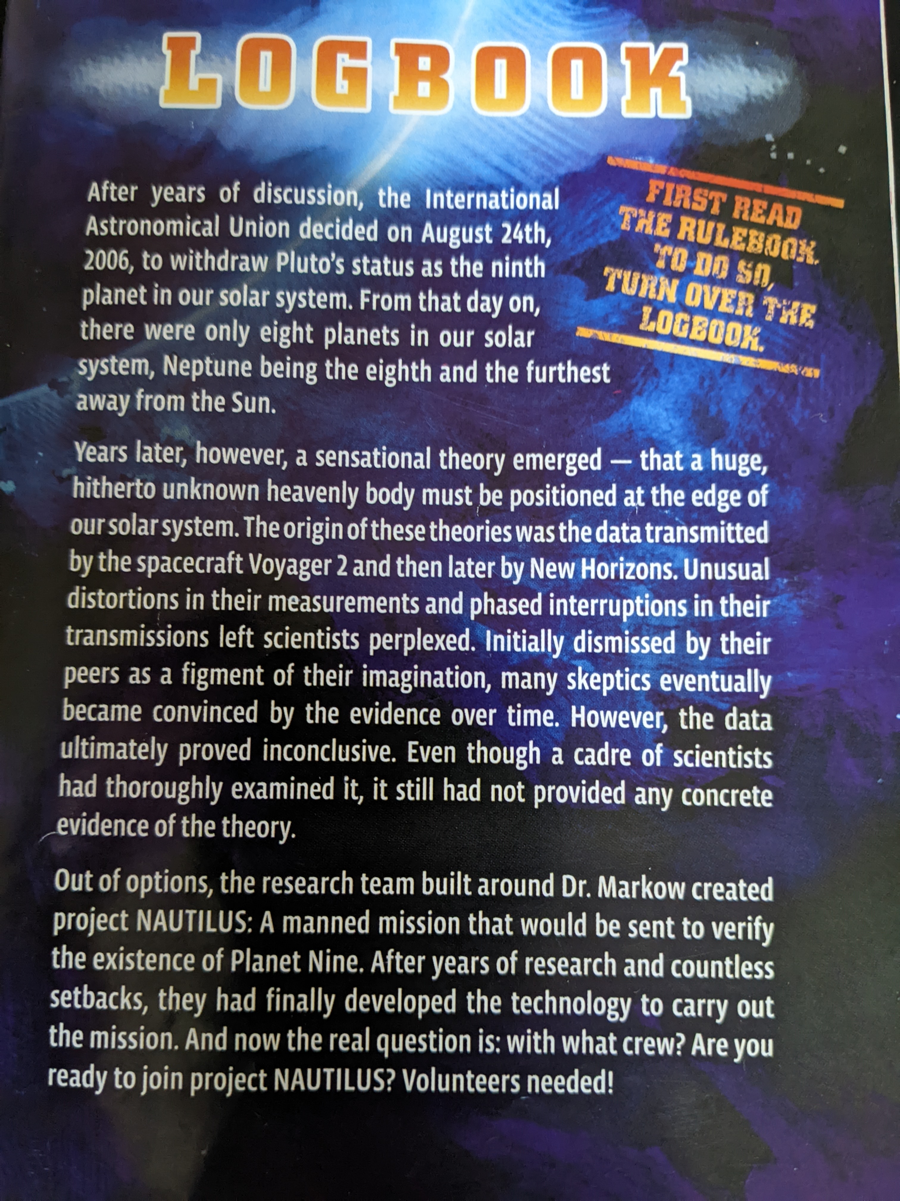 On the back of the rule book, you will see this hook to the adventure you will go on if you choose to continue to open the pages. It tells the story of a group of astronauts who go through training, blast off from Earth, and the problems they encounter along the way as they pass the various planets of our galaxy. Each challenge comes with a little flavor text that you have to read before you try to overcome the challenge. The flavor text is about all there is to the theme of the game. Yes, there are some that work better with the challenge as opposed to others, but for the most part, they don’t really add much to the overall experience of the game. Yes, we would take the time to read the flavor text before each challenge, but most of them end up being pretty forgettable as you spend more time trying to get over the challenge rather than think about why you are getting over that challenge. For the most part, they could have tagged any story to the game play and it would have felt exactly the same, and this is not why you play the game over and over again.