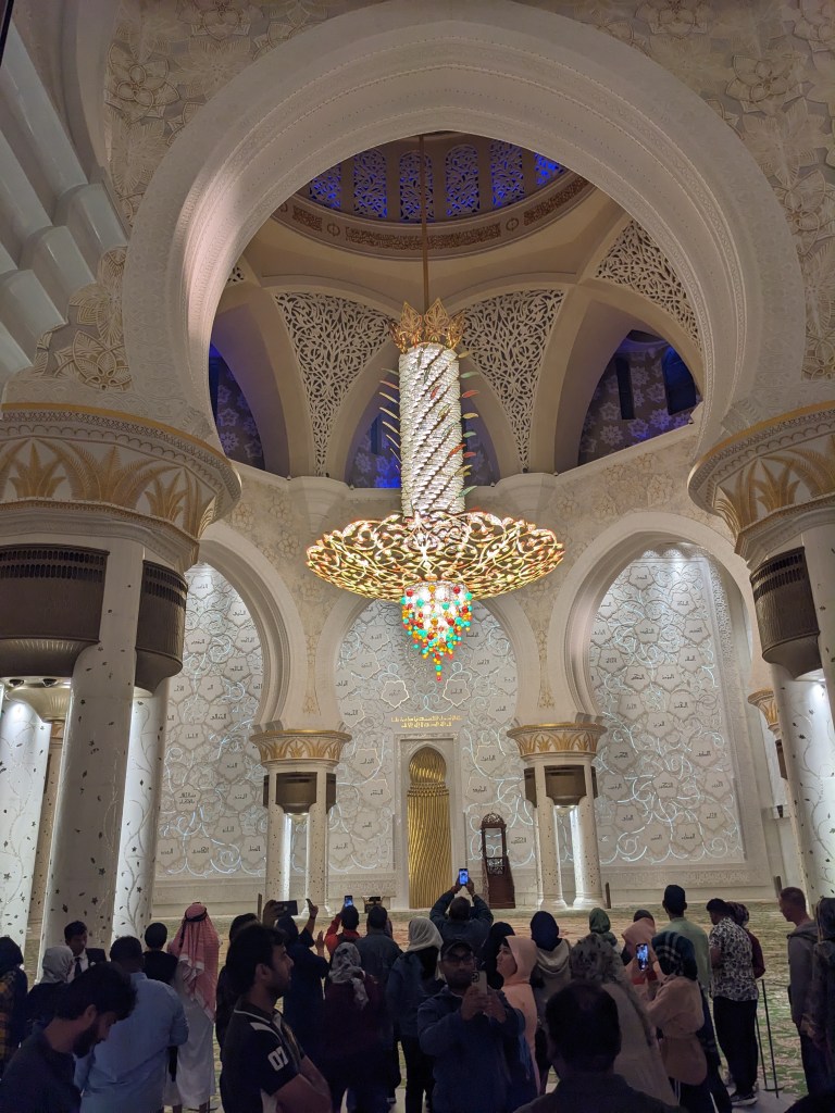 There are also chandeliers in both mosques, and they are something to marvel at. They are massive. The one in the center of the picture is so big that I am told it has a staircase in the middle of it, so people can enter it and maintain it. They are also strategically place, so they not only offer light, but they illuminate parts of the room, such as the niche, to enhance the artwork that was designed there.