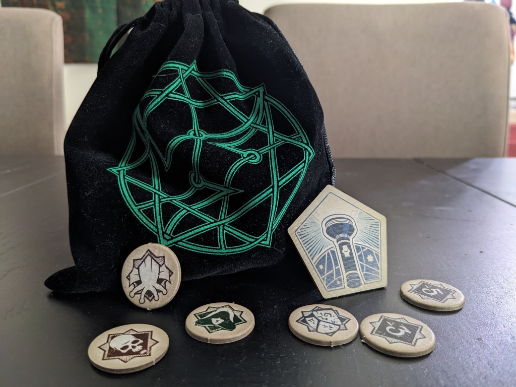 With that in mind, I am glad I stuck with it. Though the rules can be a little fiddly, once I was able to figure them out, it added even more to the experience of playing this game. There is a little bit of a deck building aspect to the game, and each character that you can chose to go through the story has different attributes to help you either go through it. Some of the cards are really powerful, and each player has weaknesses that add the problems that are encountered throughout the story. Dice are also not used, but there is a bag with a variety of chips in it that can change the difficulty of the game, depending on how much of a horror experience you would like to have. I also love the make-shift game board that is created by cards, and the little book that is created by the story cards. It makes for the perfect Lovecraft experience.