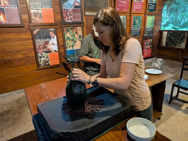 When all of the beans’ shells had been removed, we moved what was left over to a large flat stone, and used a larger rounded stone to grind the beans into a nice powder. It was a good start for what needed to happen, but the stone did not get the cocoa into a fine enough powder, so this is when we moved over to the next step.