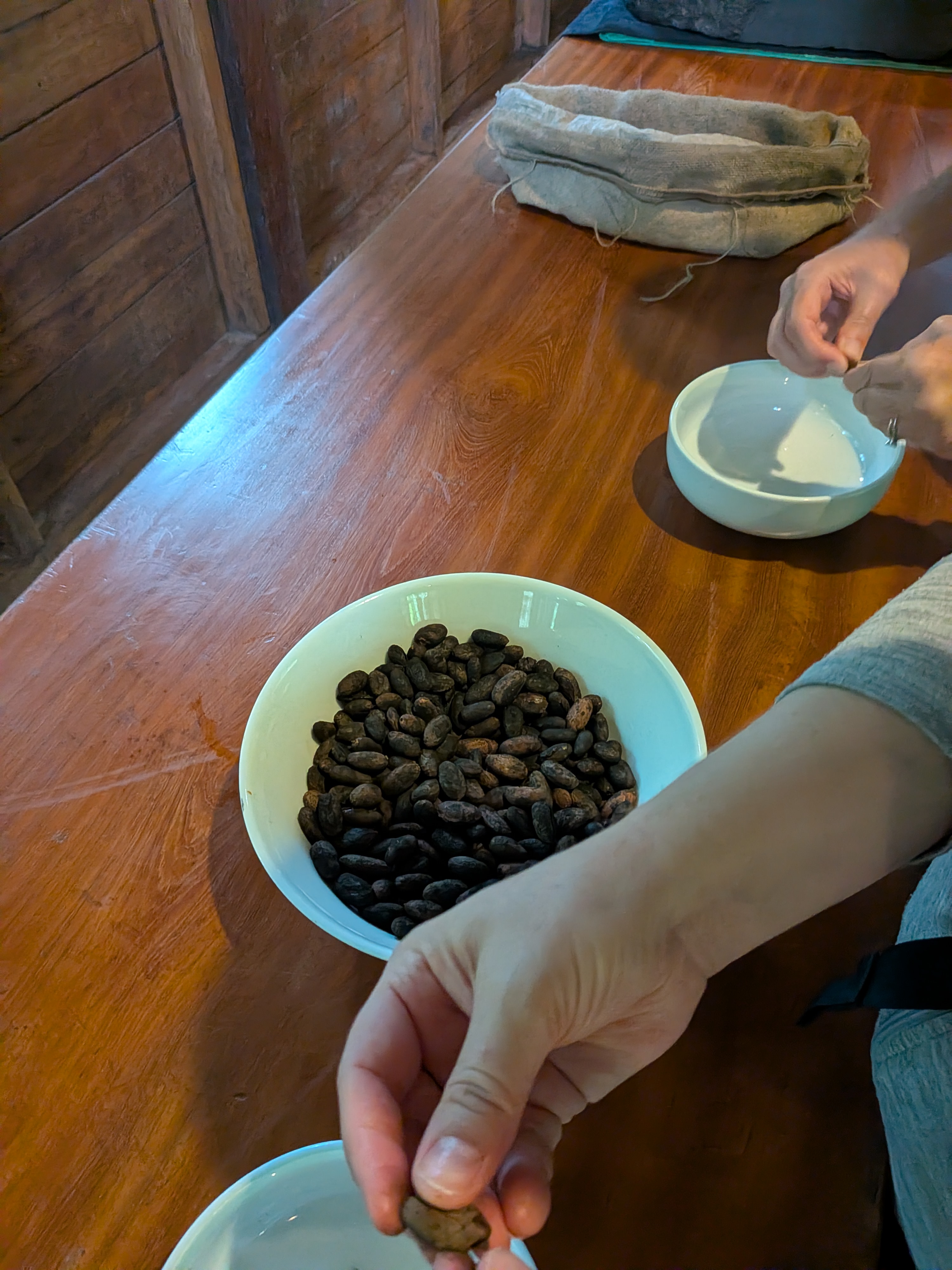 The first process is taking off the husk from each of the beans. It is easier than I thought it would be, and there was only a couple of times when the bean turned into a powdery substance that would be used in making cocoa. It also left the tips of my fingers with a fine powdery substance that when licked made me feel like I was eating the cereal Cocoa Puffs.