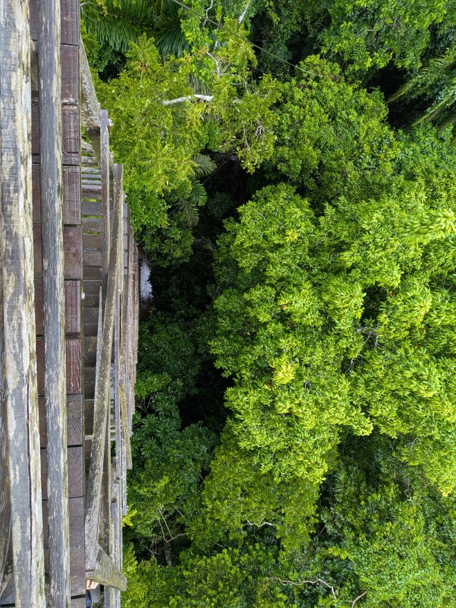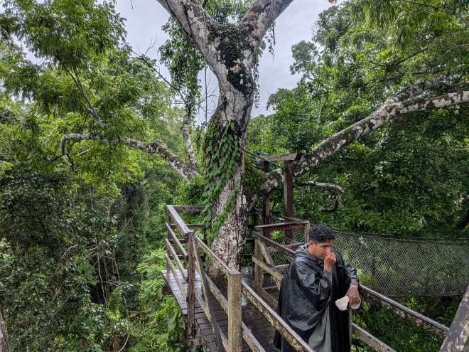 Still, being wet did not take away from the experience. I climbed up a tower built out of rust wood, a strong wood from the forest that looks like it is rotting away, but is actually super strong. The tower took us up forty meters to look down at the first canopy of the forest with six suspension bridges in-between the two towers that were connected to the bigger trees in the forest. The goal was to walk over the six bridges to get to the other side while looking down on the forest and hopefully catching sight of some of the birds and animals that live in this altitude of the trees.