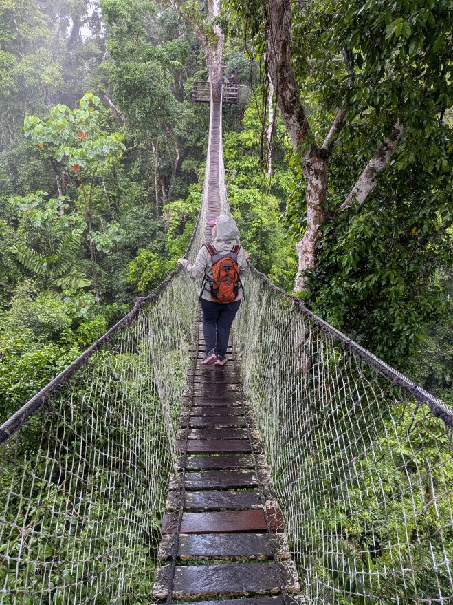 Because of the rain, we were not able to find any animals, but it had cleared off enough for us to enjoy the view. They would only let one person walk across the bridge at a time which was probably a good thing because even with one person, it was rather bouncy. It also caused us to take a good amount of time for the whole group to get from one side to the other, but once things got started on the bridges, it did not feel like the wait took too long between the bridges.