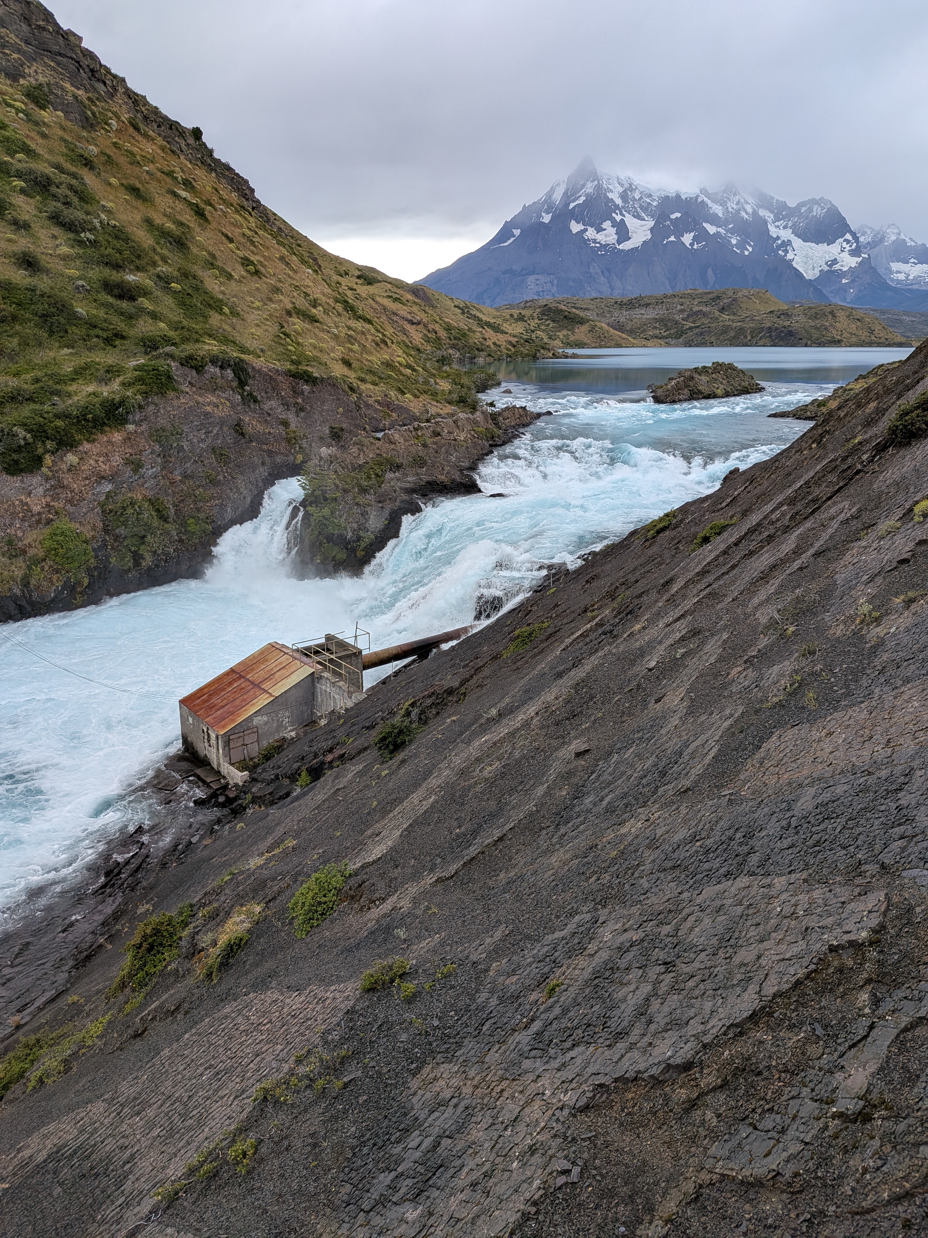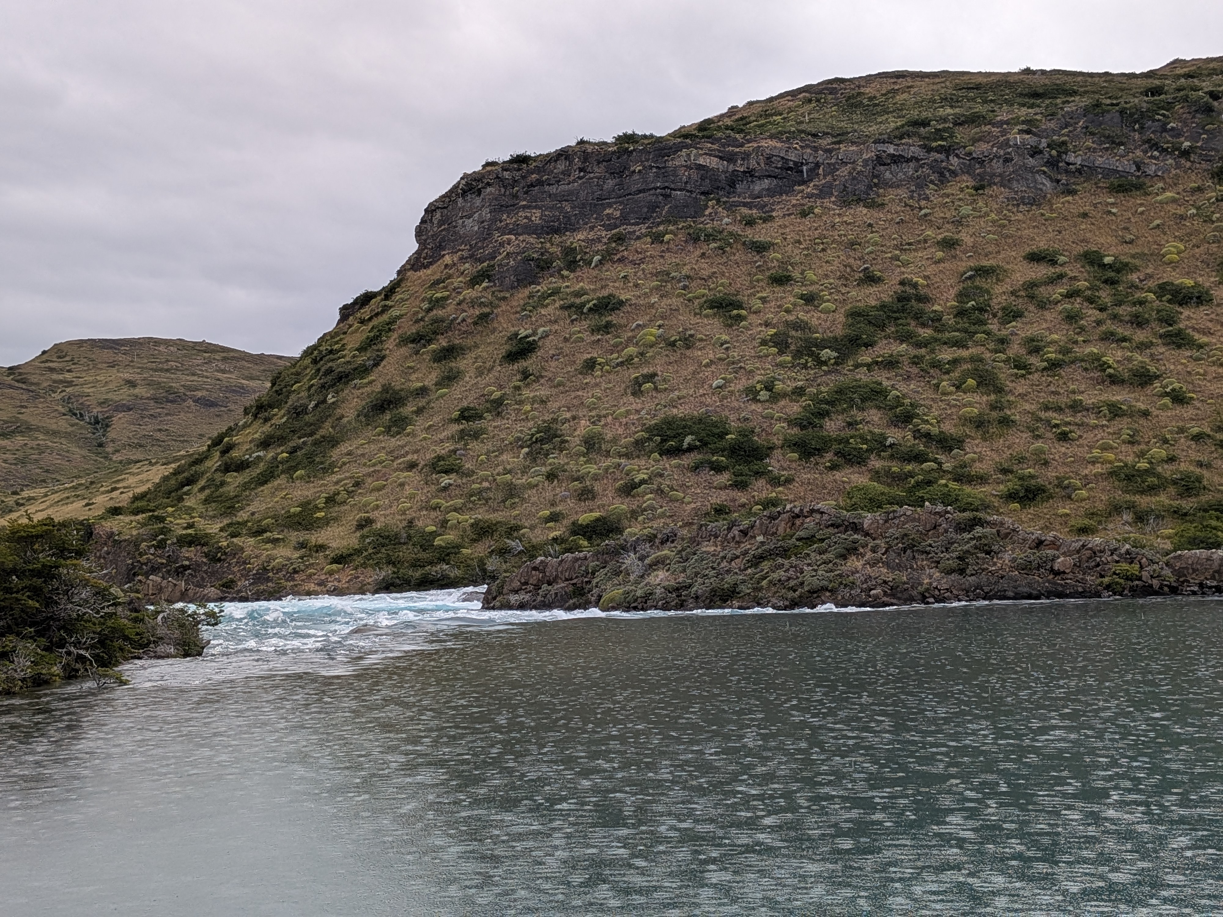 We traveled from Campground Pehoe by turning right out of the parking lot from the restaurant and walking fifteen minutes to the Explora Hotel. The boardwalk was hard to miss when looking from the right side of the road, but this was the back part of the boardwalk, and we made a few mistakes from this point. When wer got to our first four-way intersection on the boardwalk, we thought taking a right would be the logical choice because this led to the lake and we could hear the waterfall coming from this direction. But this was incorrect. This took down to a dock where a large boat was parked, and we could see the rapids that were formed at the top of the waterfall, but could not see the waterfall itself. It was still okay because we had some beautiful views of the mountains in the distance and the whole lake, but we knew there was a better view, and we just needed to find it.