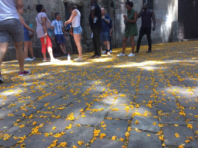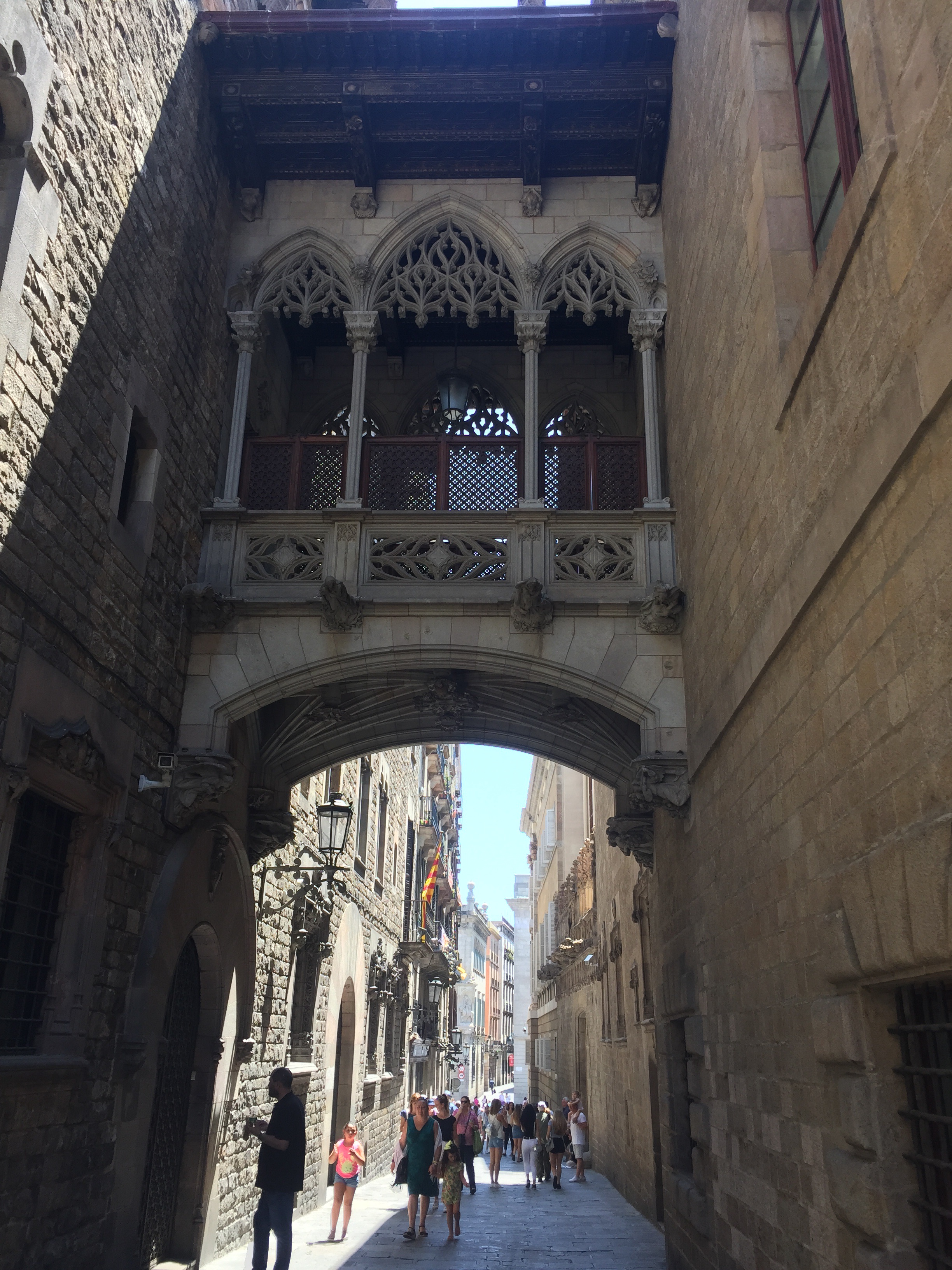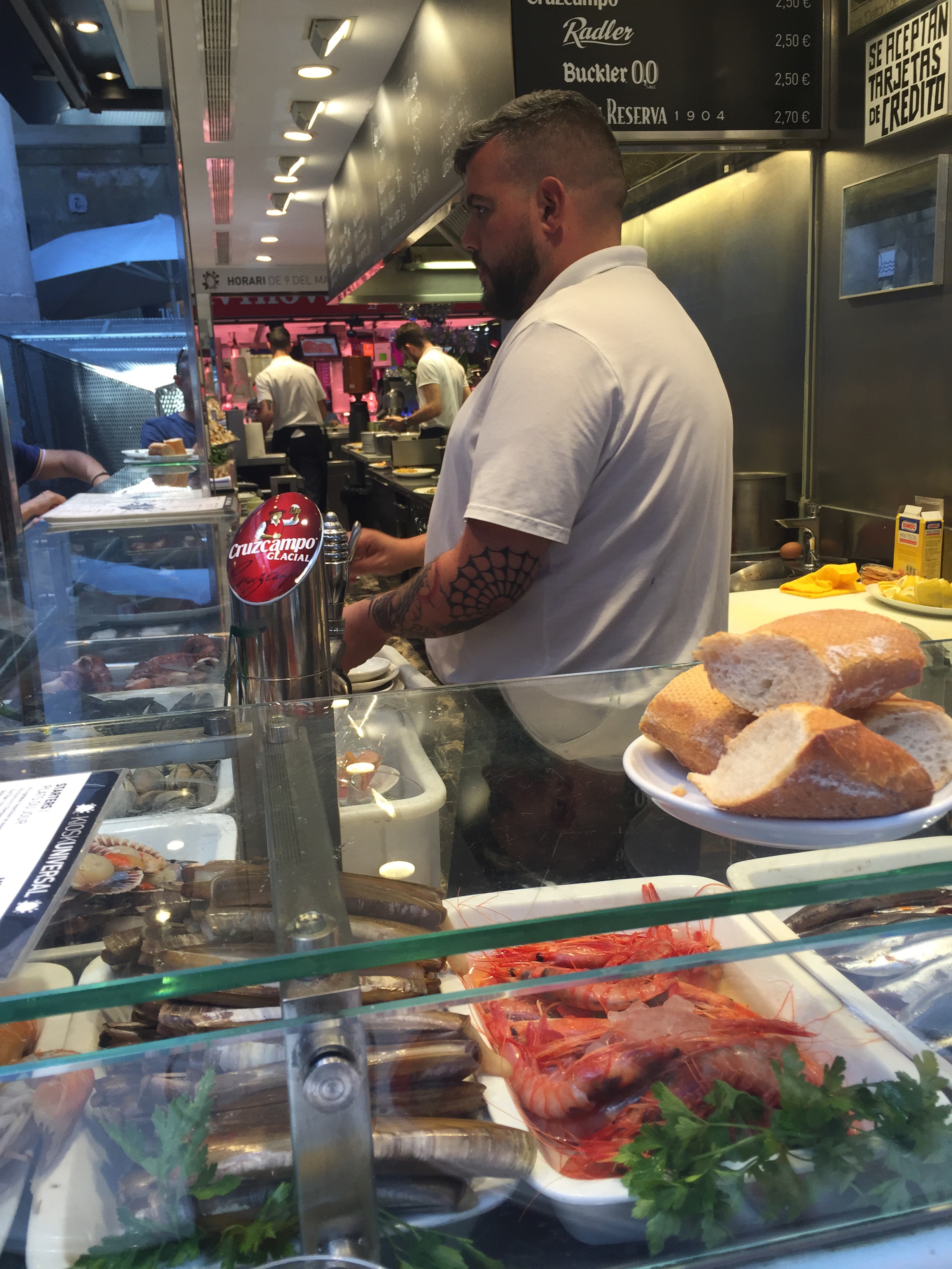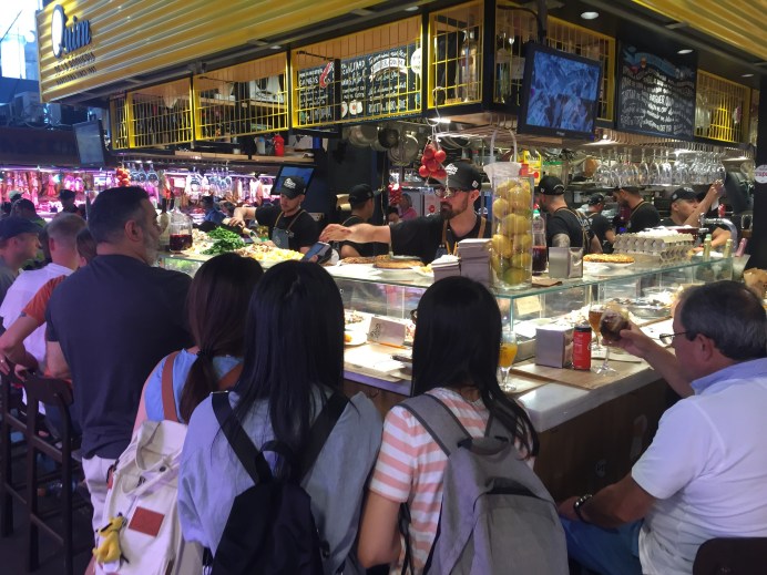 Unfortunately, I have not had the opportunity to make a meal yet, but it has not bothered me much because I am in Spain, the land of the tapas. A tapas bar will serve small portions of food, allowing you to have many different bites along the way. There are some traditional dishes that all bars will include, but it is fun to see the different creative ways a chef can piece together a meal out here. One of the best ones that we were able to experience was called Tapeo. It is a small place next to the Picasso Museum in Barcelona. They have many traditional items, but they also blend in some Japanese flavors into their dishes such as this salmon potato dish that included a wasabi sauce that you could sprinkle on the top of the dish.