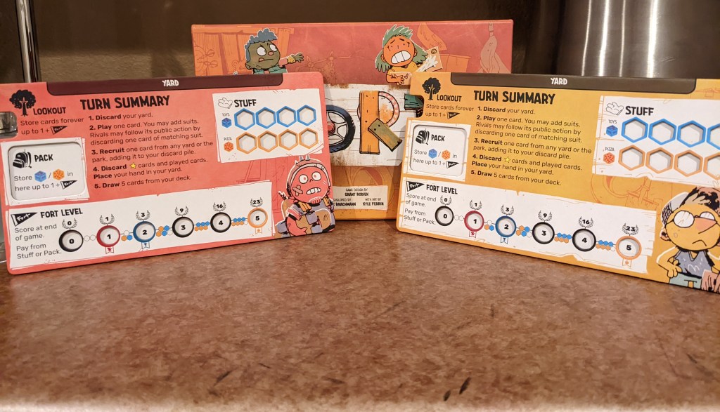 This interaction does add a little bit of fun to a two player game, but because only one kid from your yard can be taken each turn, your hand does not change that much throughout the course of a game. In a game with more players, this interaction becomes more important. Players can gang up on another player if they see that this person is getting closer to one of the win conditions. One player could lose a lot of their cards making their hands less powerful and they would need to build up their group of friends again. It adds for some fun moments and the kids that get traded around start to get their own personalities that add to the overall story you are creating as well.