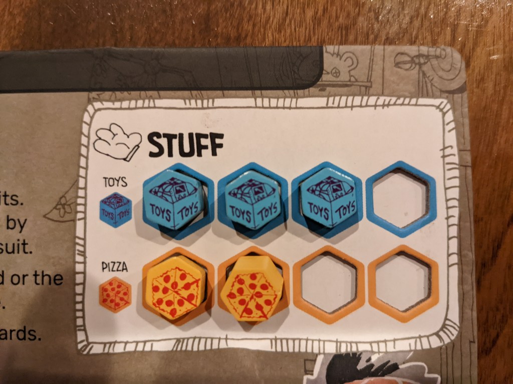 The design is not only based upon the drawings either. The resources that you gather are nice chunks that have a toy box or pizza painted on one end. They fit in nicely into each player board. The player boards themselves are these chunky pieces of cardboard that has indents in them that allows for fun manipulation of all the piece that you collect throughout the course of a game. And on the back of each board is the background of each player’s best friends which though not necessary, is a still a nice detail that adds to the overall enjoyment of the game.