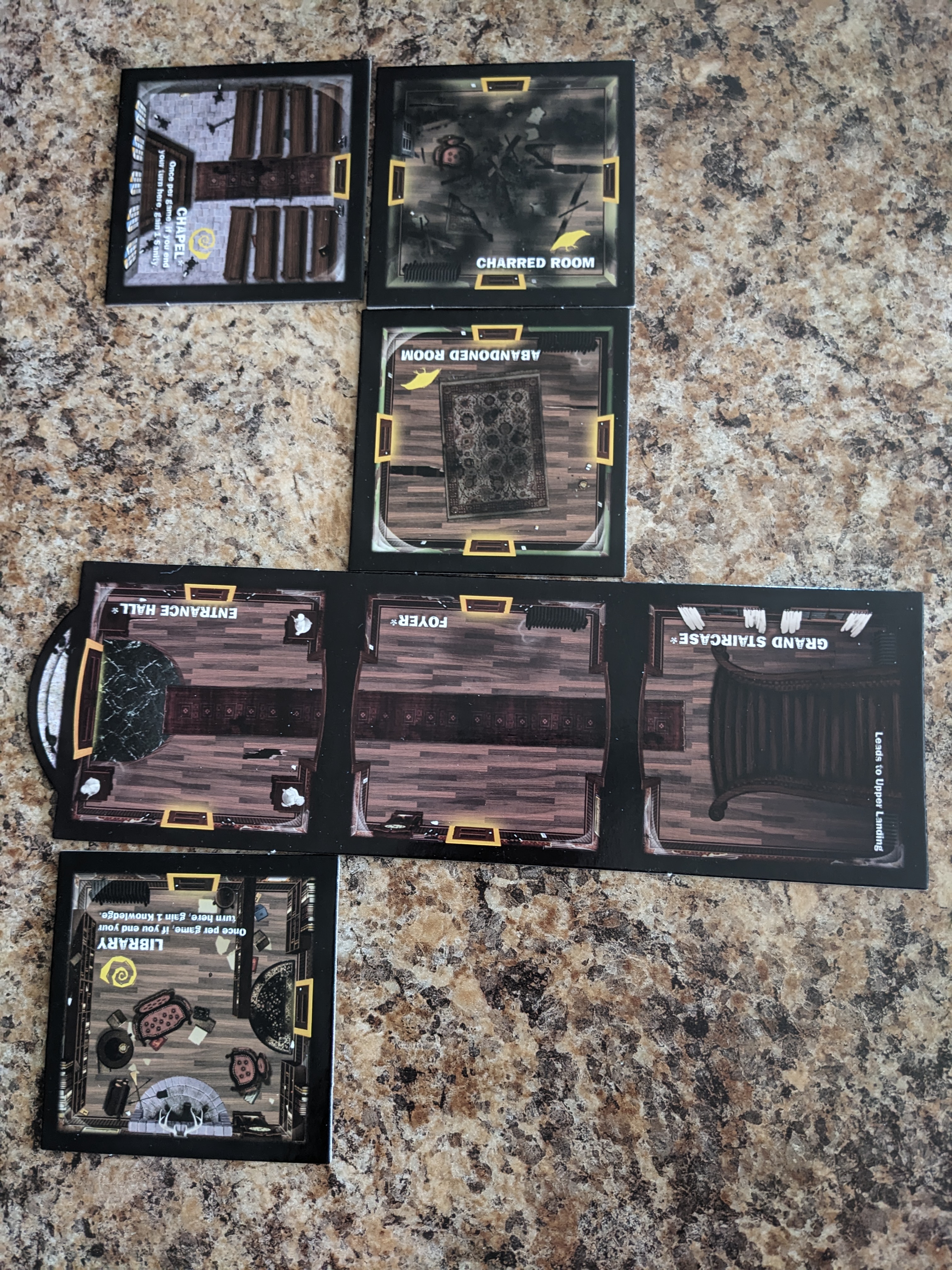 The game is broken up into two phases. The first phase is the exploration stage. During this phase, the characters start in the entry way of a haunted house. Each character is unique in their abilities. Some are faster and stronger; whereas, others are smarter and have a stronger resolve. Each of these abilities can grow stronger as the characters explore the house. On each of their turns, they flip over a tile to add to the map and then follow whatever is triggered by the room they enter. Sometimes this is a trap that will have them fall down to another level, or a mysterious room that will transport them to another part of the house. Most of the time involves finding an item, encountering an event, or experiencing an omen. The omen and event cards cause the character to try out their luck against the situation by looking at their abilities on their cards and rolling the amount of six sided dice that is indicated by their number. The dice only have zeroes, ones, and twos on them. After they roll, they add up the points, reference the card with the amount they rolled, and see what happens.