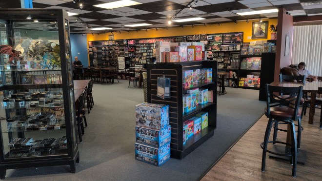 What I found there was one of those places that I had been looking for ever since I have gotten back into the board game hobby. It was a cozy little cafe with large tables where you could set up games for up to ten people if needed. There were plenty of tables too and when I asked if I would need a reservation for a table, they chuckled and said that this was not usually necessary. They also sold a fair amount of good games, books for various role playing games, miniatures for these games as well as the paint to make them your own.