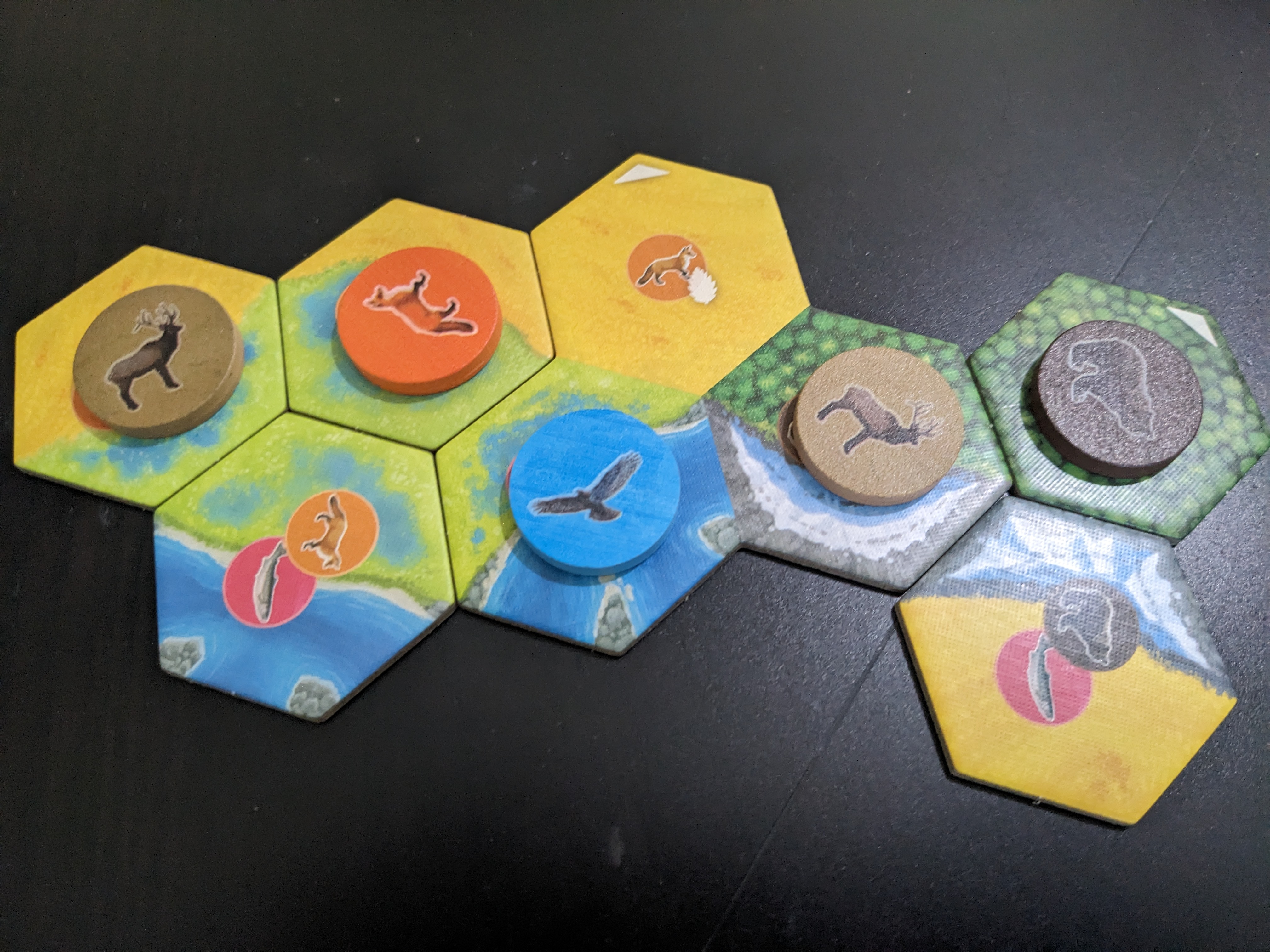 I love the teach of this game. It is really simple, giving people only four choices per turn. In front of them there are four environments paired up with a type of animal. They pick one of the pairs, and add it to their environment. In the course of the game, they are trying to create bigger environments because they will get points for each of the five types of environments based on how many hexagons they have connected. They will also try to place animals on those overall landscape in certain ways that will also collect a certain amount of points. If they place an animal on a single environment place, they earn a pinecone that also collects points, or the pinecones can be used for special powers during the pick phase that allows a player more options of what they can grab. That is basically all you need to know in order to play the game.