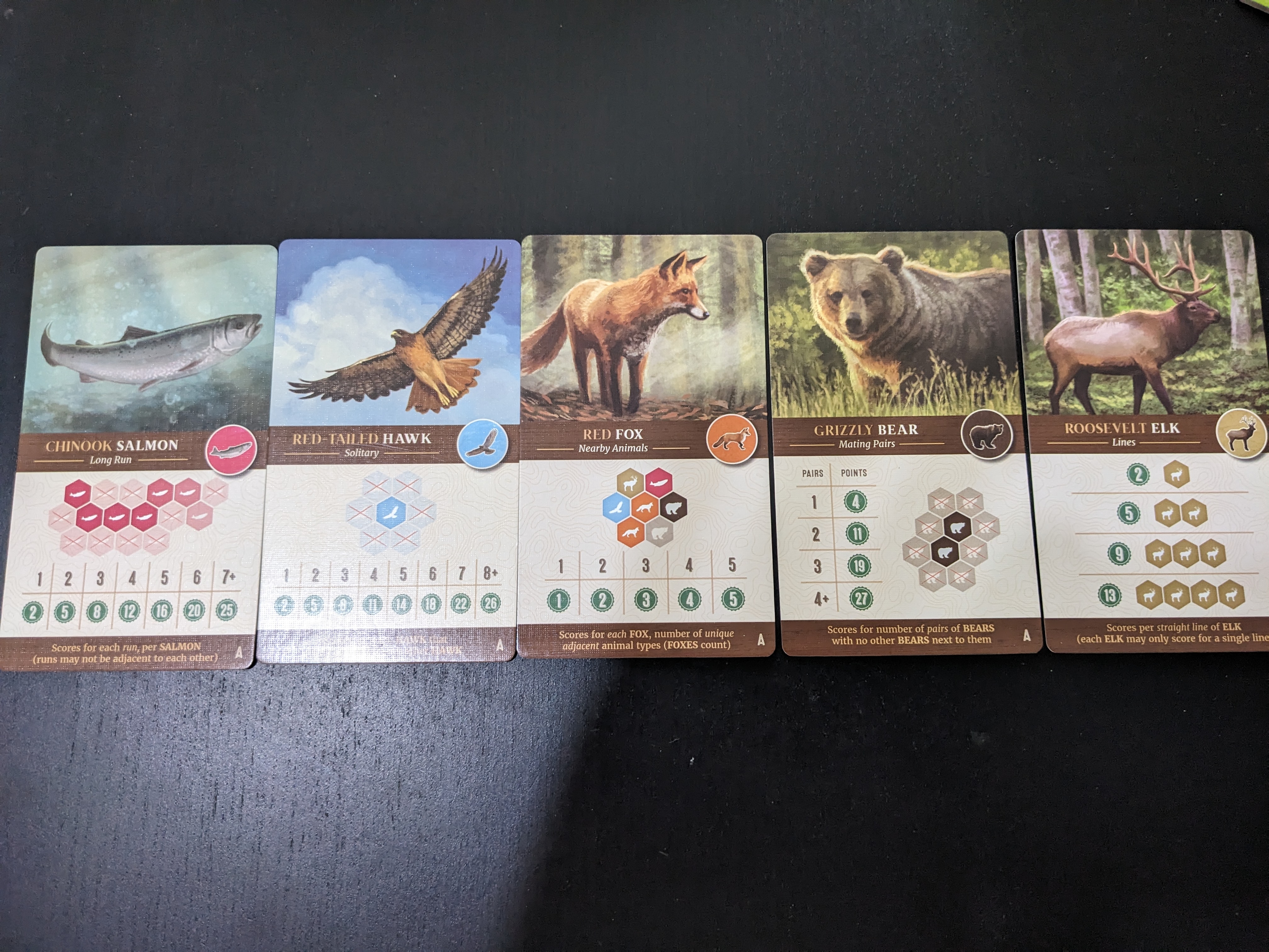 Building a wilderness in the Pacific Northwest and populating it with animals does not sound like it would sing very well as a board game. It would feel like just something that was plastered on a game with good mechanics, but I think it was the other way around. The five environments in this game as places that are easily spotted all over Oregon and Washington, and the care given to the animals and their placement also lends itself to the care of understanding these balanced ecosystems. The ways the bears, foxes, elk, and hawks interact with their environments work very similar to how they would in real life. The animal, salmon, is the one that does not always seem to work the way that they should. Granted they do create salmon runs, but this does not always make sense when they appear in plains or mountains. Every time I have played with new people, they have questioned this choice. It is the one small hiccup in an otherwise beautifully planned theme to this game, and it is quickly forgotten once game play begins.