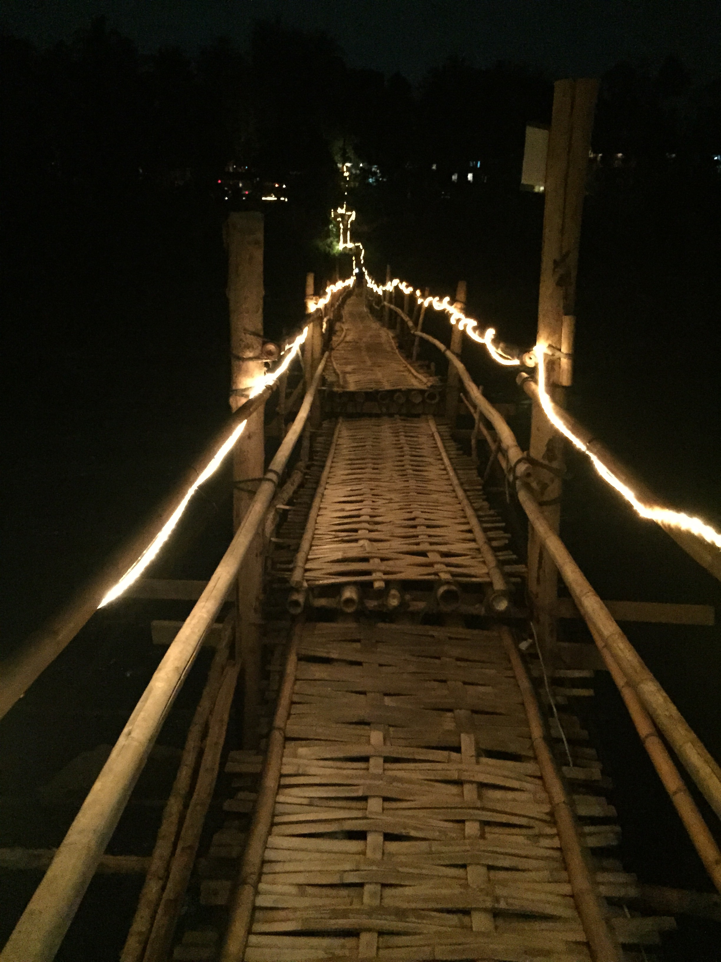 It also meant it was the last chance I would get to travel across that wooden bridge that they build every year during the dry season. The bridge did not look as threatening at night, but as soon as we stepped on it and made our way across it, we could really feel how rickety it actually was. There were a couple of holes along the way that came from the continuous use over the last couple of months, but I also knew that the people of Luang Prabang would not fix these holes due to the fact that the wet season was starting soon and the bridge would have to come down anyway.