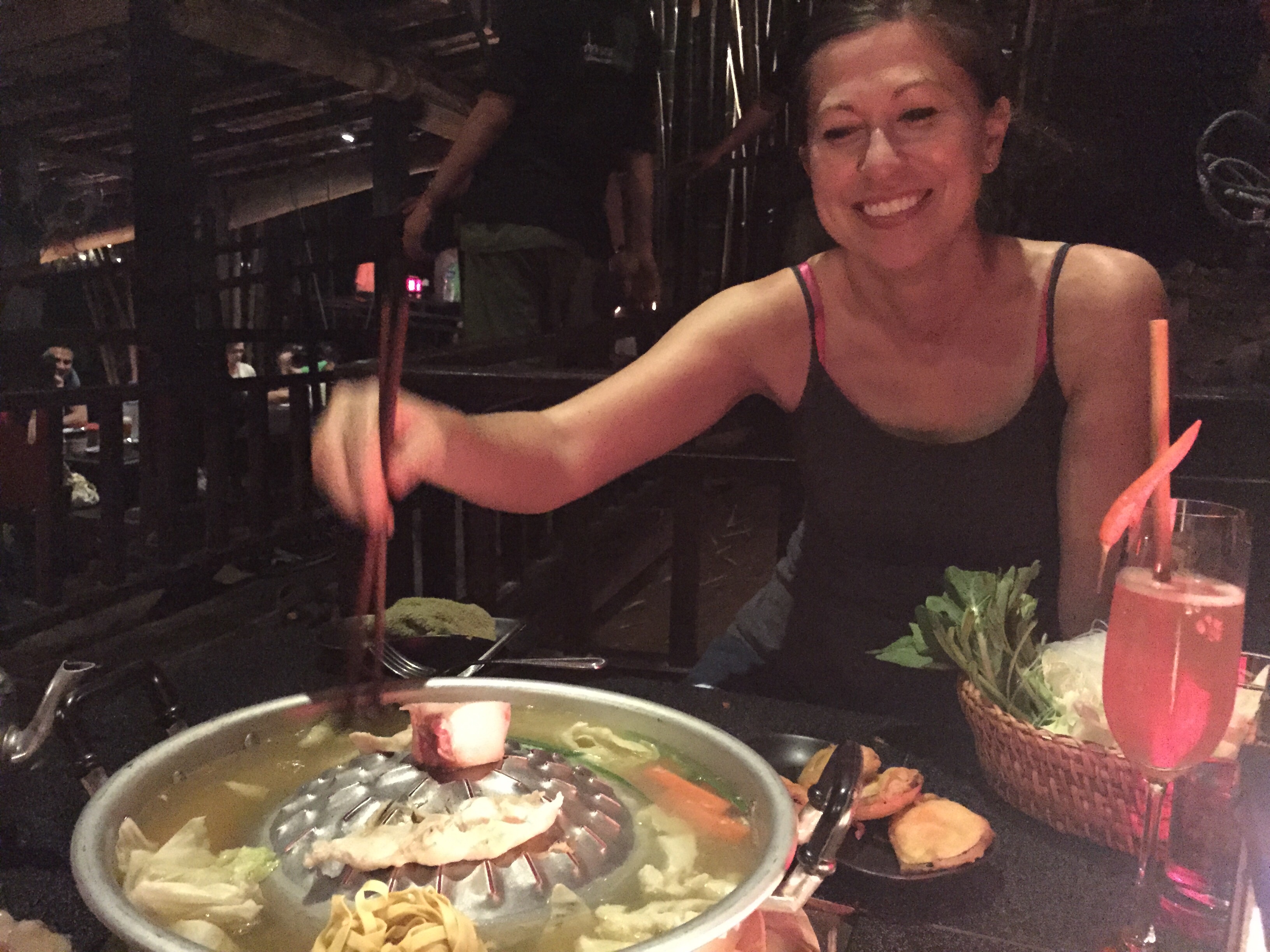 It was worth it making it across though because there was a wonderful restaurant on the other side that featured the Laos version fondue. It had many of the same features of Swiss fondue such as a nice broth to cook various kinds of food in over an open flame. But the difference came with the vegetables they used adding such things as cabbage, and scallions, and the addition of noodles. The meat was also cooked on a grill rather than being heated up in the broth. Add some of the spicy peppers to the broth and it made for one of the best meals I had while I was out there.