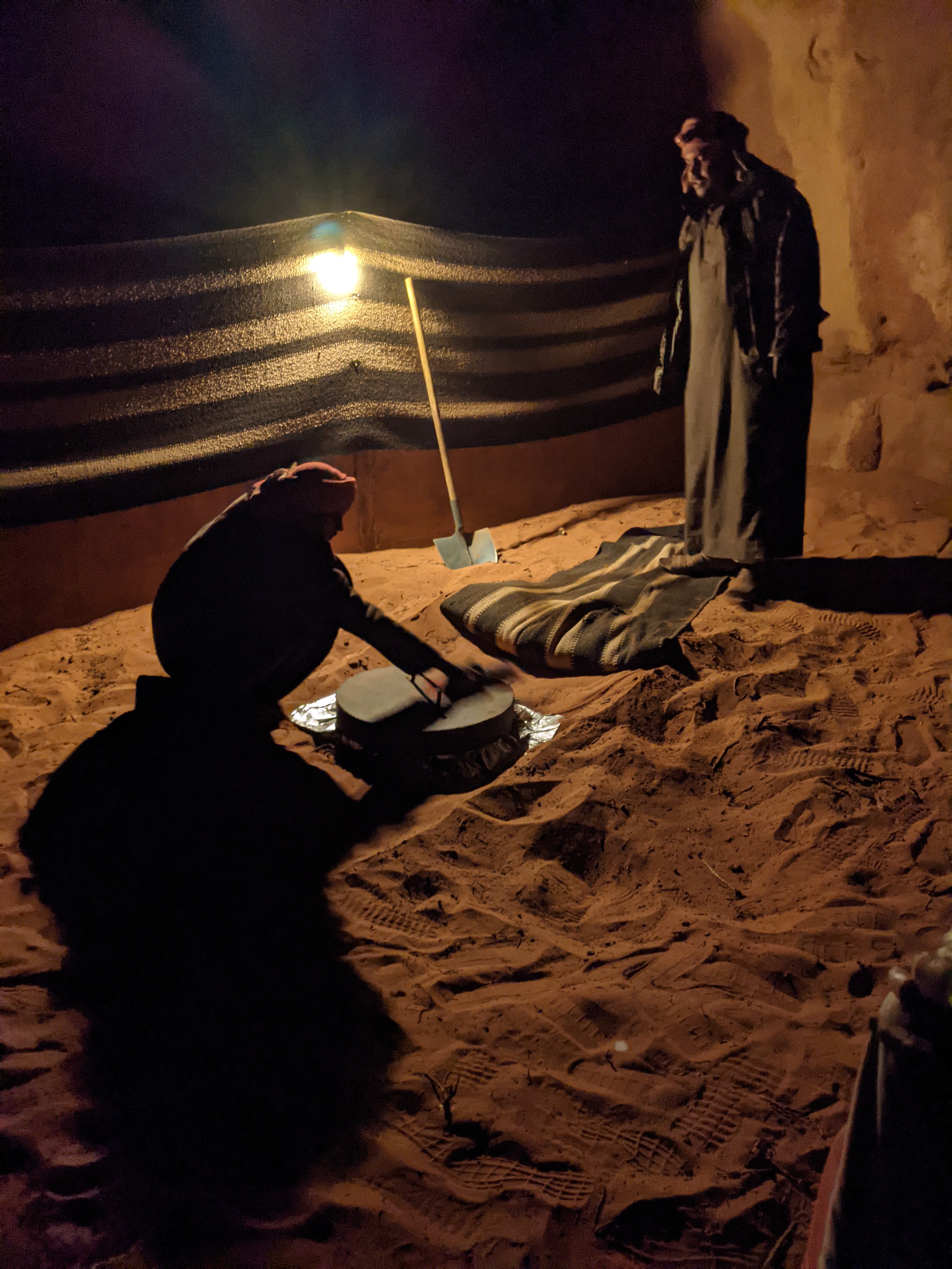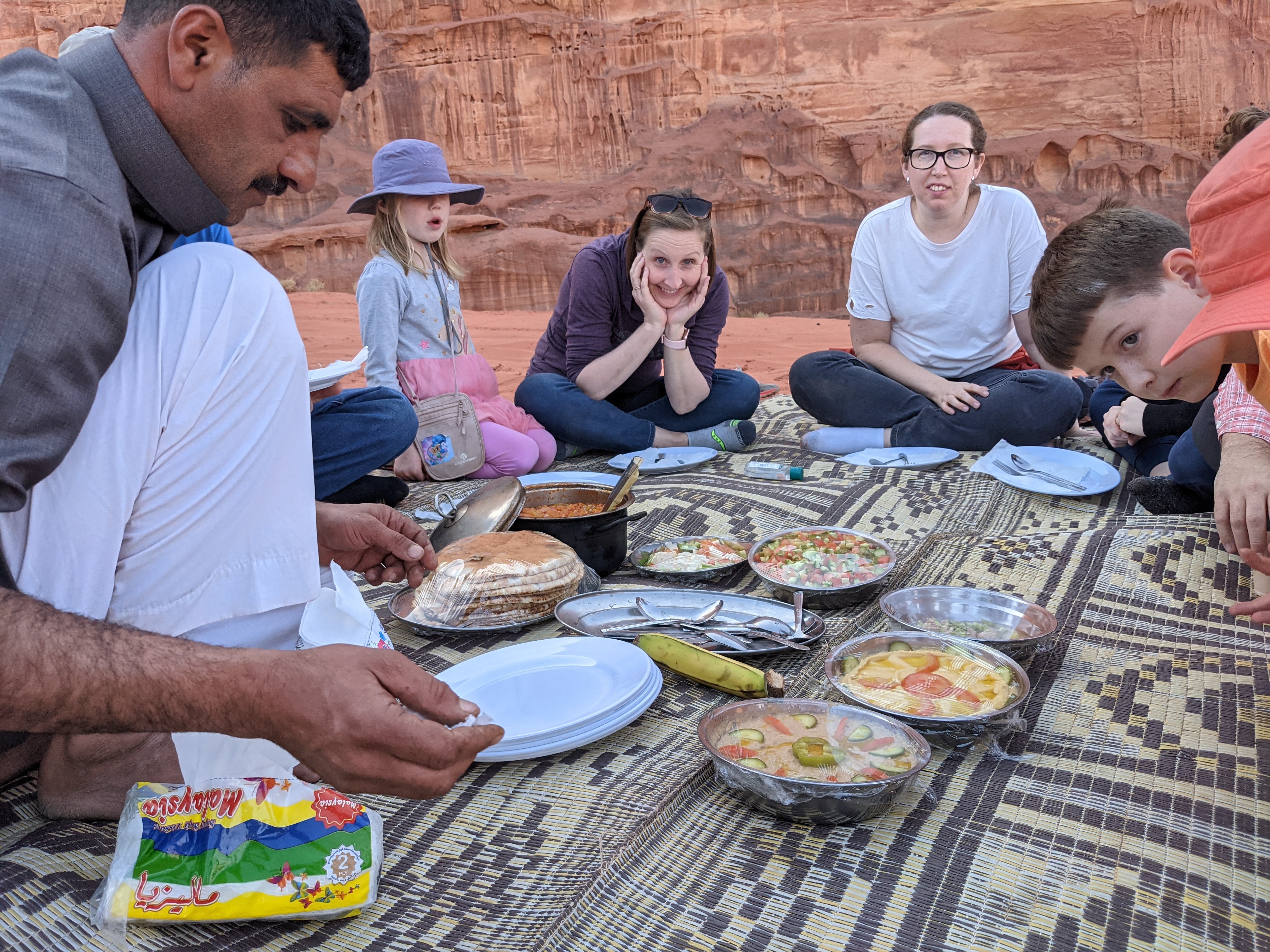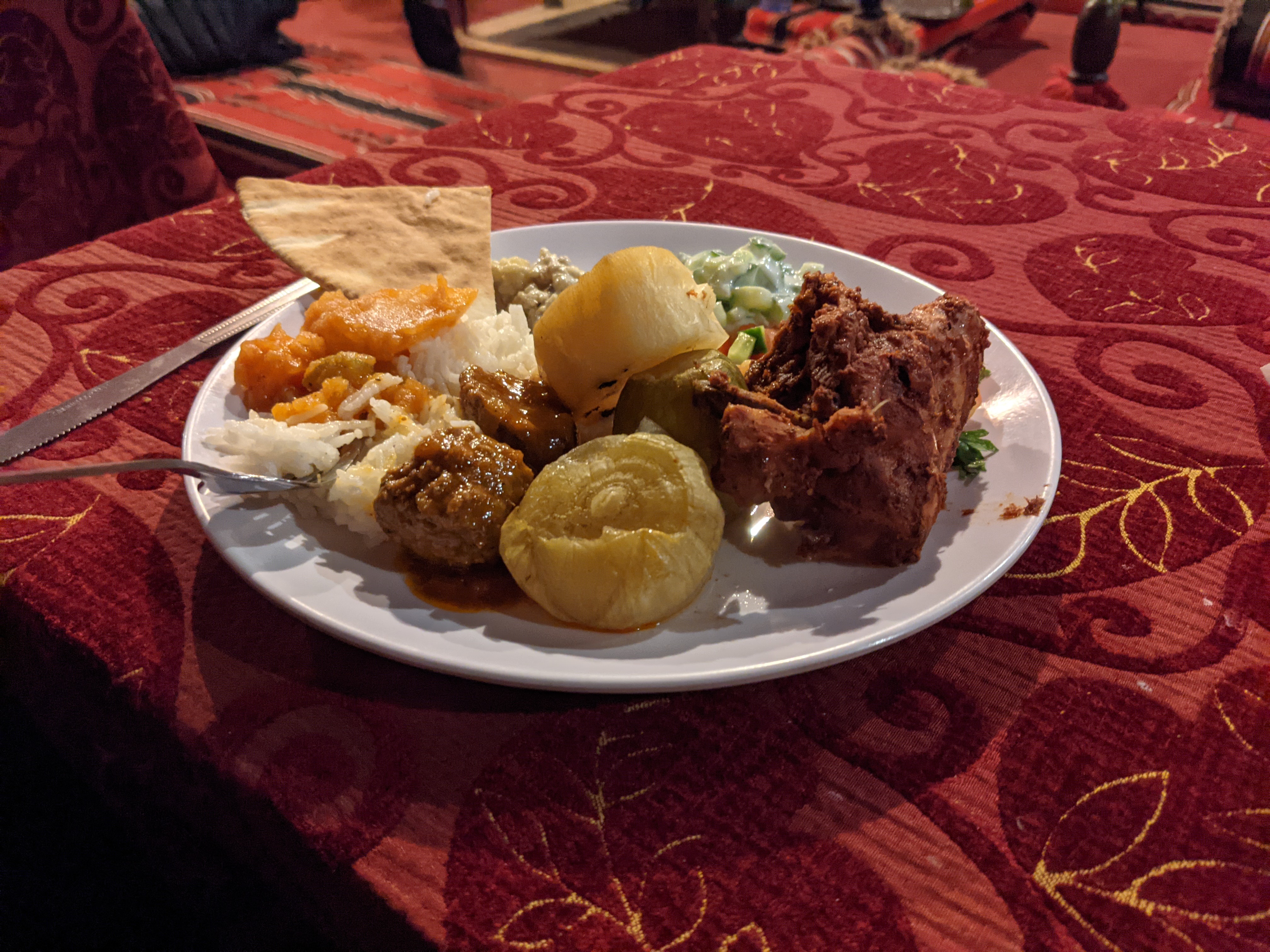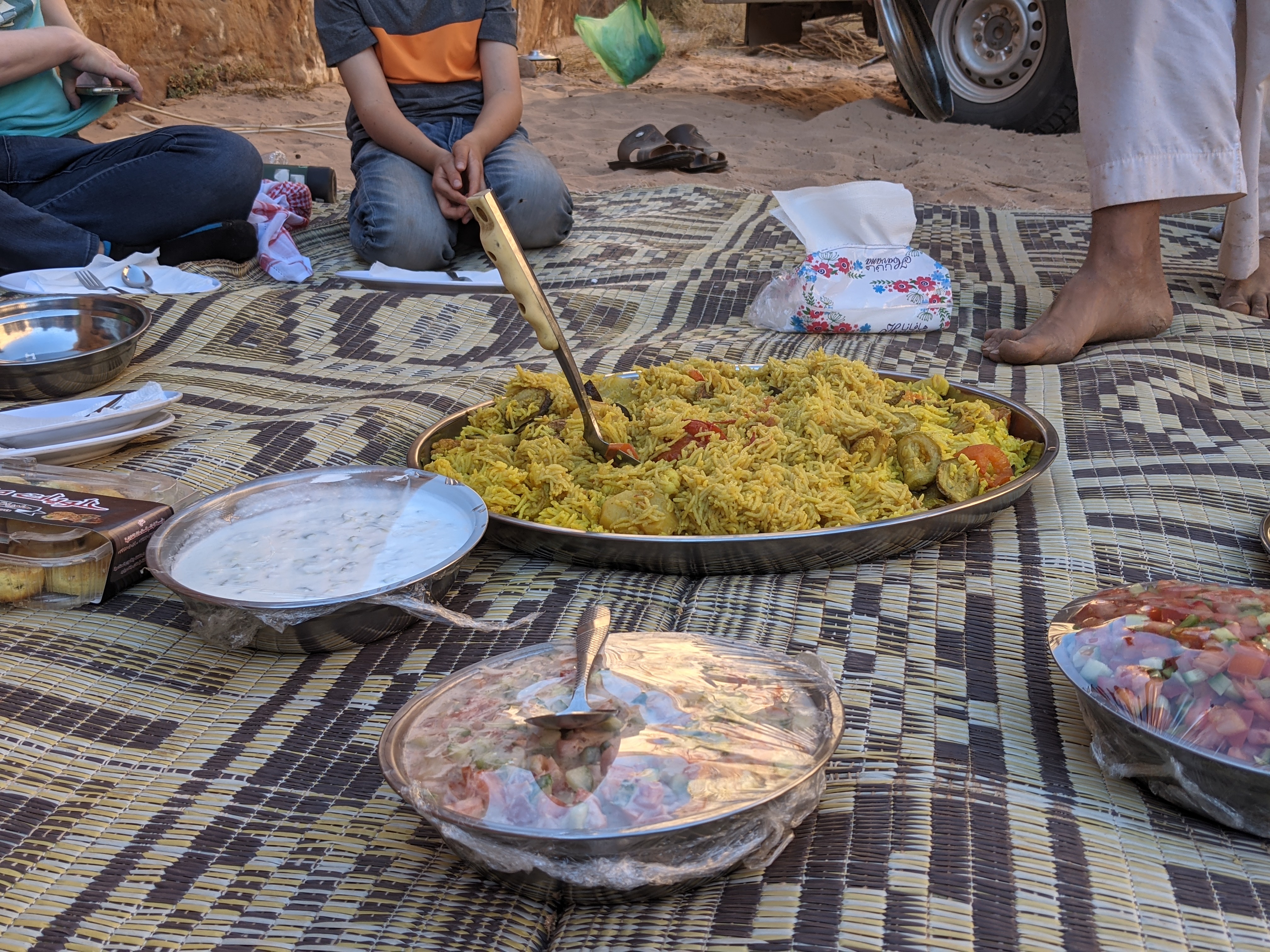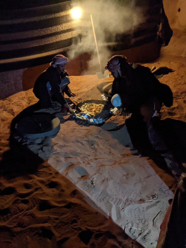 It might not have been what I was expecting for a Thanksgiving dinner, but the food and the way it was prepared made for a great Thanksgiving experience. The Bedouins having been preparing huge feasts for centuries out in this desert. It basically starts when they dig a hole in the ground and fill that hole up with burning coals. They then add vegetables, and chicken, cover that hole with a blankets and some sand, and let it cook for two hours.